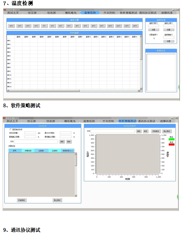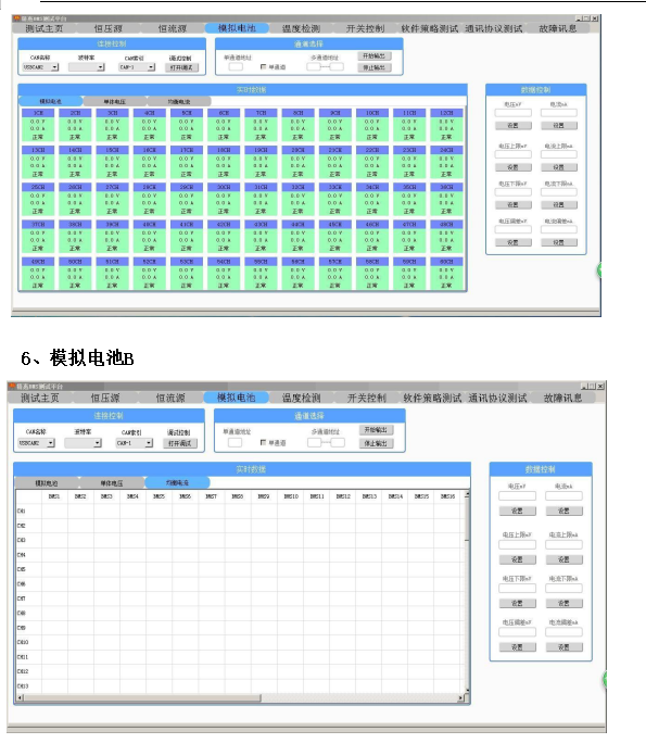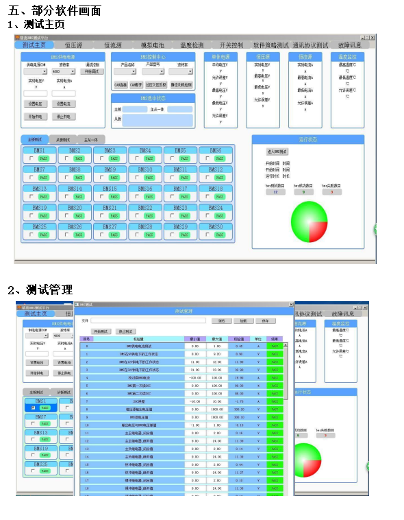 一、概述 本設備主要用于電池模組、電池包電壓失衡修復。將待均衡電芯接入后,手動(dòng)設置電池類(lèi)型、均衡終止電壓、均衡電流、保護參數(如單體過(guò)壓保護值、單體欠壓保護值、單體過(guò)溫保護值、充電過(guò)流保護值等),參數設置完成后,設備根據均衡條件自動(dòng)完成每個(gè)通道的充電或放電分配,在均衡過(guò)程中,若電芯電壓已經(jīng)達到均衡終止條件,則該通道進(jìn)入待機狀態(tài),其它通道繼續執行充放電,直至所有電芯均達到均衡終止條件為止。 二、主要測試功能 1)支持1-32串以?xún)热我獯當档碾娦荆ㄢ佀徜?、鐵鋰、三元等)充放電均衡。 2)支持電池組單體電壓檢測,檢測范圍1-5V,精度±0.1%FS。 3)單通道滿(mǎn)足最大20A充放電均衡電流,均衡電流大小需可進(jìn)行手動(dòng)設置。 4)具備過(guò)充保護、過(guò)放保護、極性反接、短路、交流輸入過(guò)壓/欠壓等保護功能。 5)采用受控的均衡方式,通過(guò)檢測電池的單體壓差,大于設定的值后開(kāi)始均衡。 6)支持上位機屏幕顯示電池組狀態(tài)、參數、每節單體實(shí)時(shí)電壓、每個(gè)電芯充放電電流等。 7)具備獨立的溫度測量,可設置溫度過(guò)溫保護值。 8)系統具備測試數據管理功能,支持測試數據檢索查詢(xún)功能。 PACK均衡測試平臺采用模塊化設計,即一個(gè)具有完備功能的受控的充放電模塊對應單體電池,并采用專(zhuān)有的充放電控制技術(shù),保證單體電池快速充電和快速放電的要求,實(shí)現鋰電池實(shí)時(shí)在線(xiàn)健康管理調節,從而大大提高動(dòng)力鋰電池組的循環(huán)使用壽命。 支持對單體電池電壓的實(shí)時(shí)檢測和監控,充電能量的自動(dòng)測算。采用多重保護,確保電池及充電機本身的安全。同時(shí)支持流程編輯功能,便于對電池進(jìn)行容量核定,荷電狀態(tài)設置。適用于磷酸鐵鋰系、三元鋰系、鈦酸鋰系等鋰電池充放電;具有32個(gè)通道;恒流充/放電電流 1~20A 可設、輸入為 220VAC。